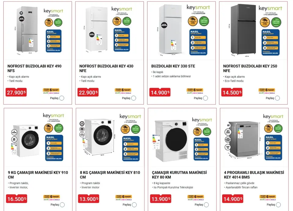 Satışa sunulacak teknolojik ürünlerin başında çeşitli büyüklüklere ve özelliklere sahip Keysmart marka buzdolapları geliyor. Kampanyanın en dikkat çekici ürünlerinden biri olan geniş iç hacimli nofrost buzdolabı 27 bin 900 liralık fiyat etiketiyle alıcılarını beklerken daha kompakt tasarımlı nofrost modeller ise 22 bin 900 lira ile 14 bin 500 lira arasında değişen çok daha erişilebilir fiyatlarla tüketiciye ulaşıyor. Statik soğutma sistemine sahip farklı bir modelin ise sadece 14 bin 900 lira karşılığında satın alınabileceği duyuruldu.